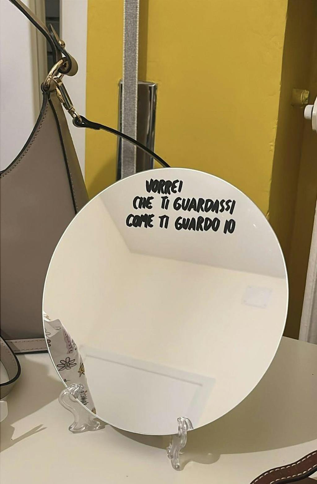 Specchio con scritta "vorrei che ti guardassi come ti guardo io"